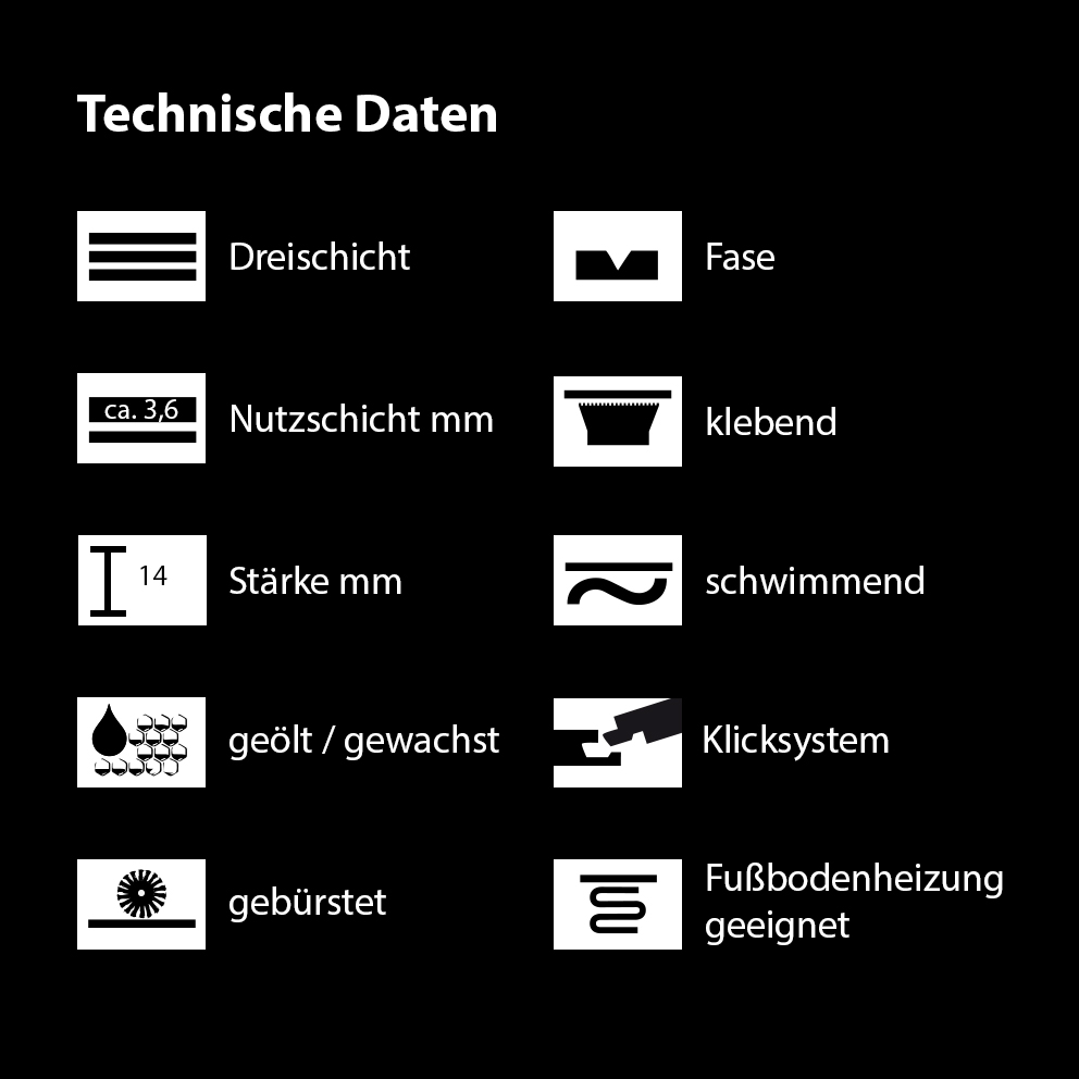 Dřevo je přírodní produkt, barevné a strukturální odchylky jsou tak jeho součástí. Případný vzorek nemusí zcela odpovídat pozdější dodávce a nemůže ani zprostředkovat celkový dojem z položené podlahy. Totéž platí pro vyobrazení produktů na těchto webových stránkách.