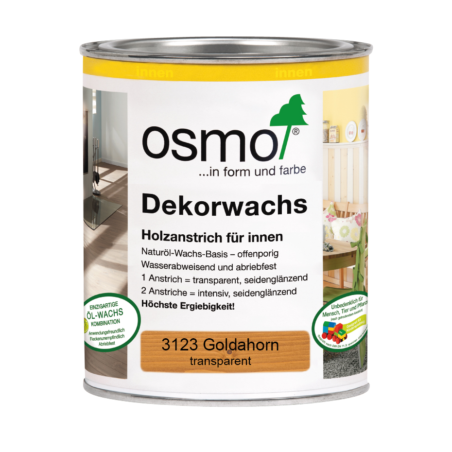 Osmo Dekorwachs eignet sich für den Schutz und die dekorative Veredelung von Holz im Innenbereich: Wandverkleidungen, Leisten und Balken sowie Türen. Es ist ebenfalls geeignet für Leimholz, Spanplatten und MDF. Ideal als farbige Grundierung für Holzfußböden und zum Überstreichen nachgedunkelter Holzflächen. Für Möbel und Kinderspielzeug besonders empfohlen.