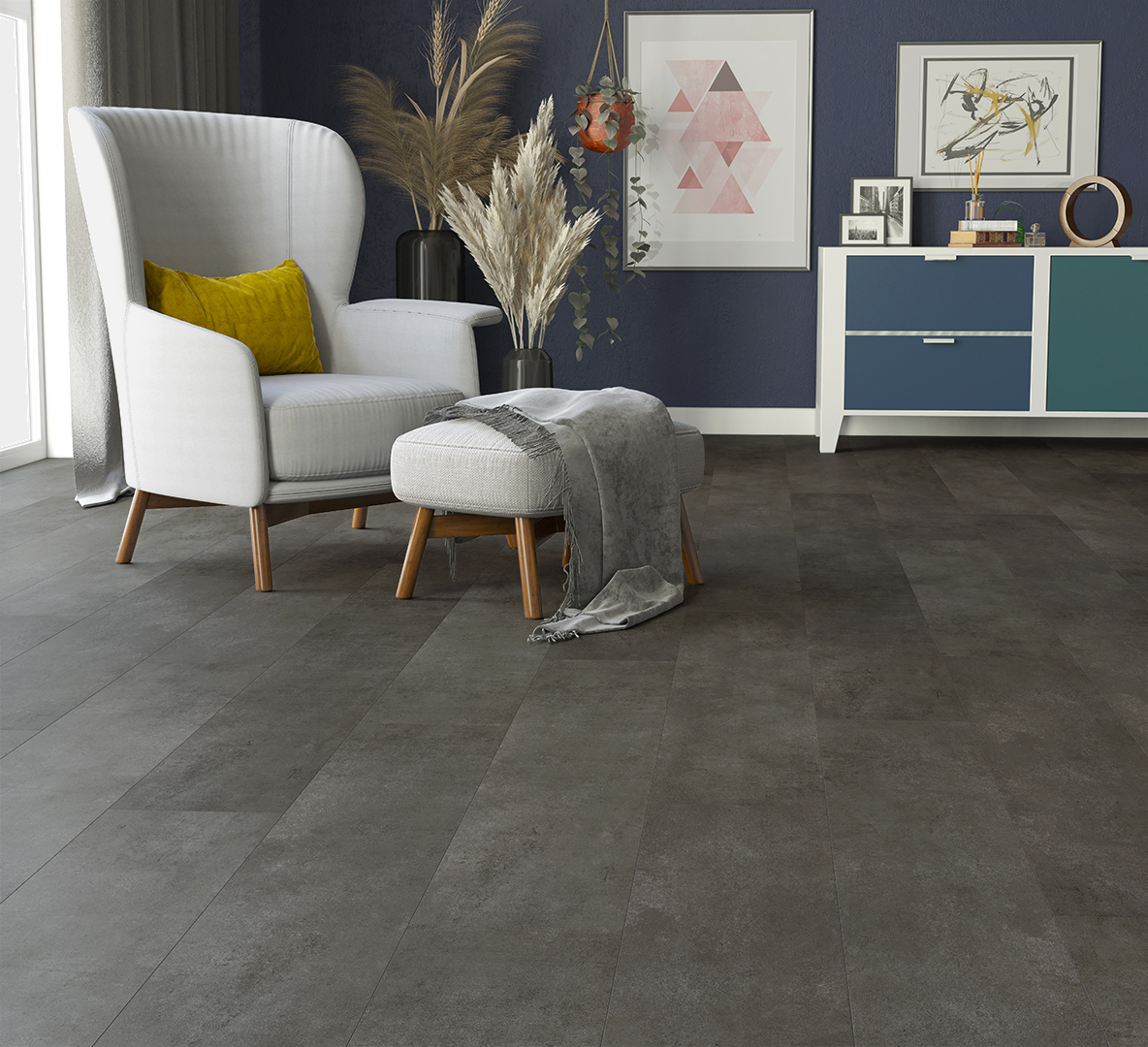 Dank Nutzungsklasse 34/AC6 sind die Designböden für sehr stark frequentierte Wohn- und Gewerberäume bestens geeignet. Die matte Steinstruktur der Designböden im Fliesenformat erzeugt eine moderne Optik und gewährleistet einen hohen Gehkomfort.