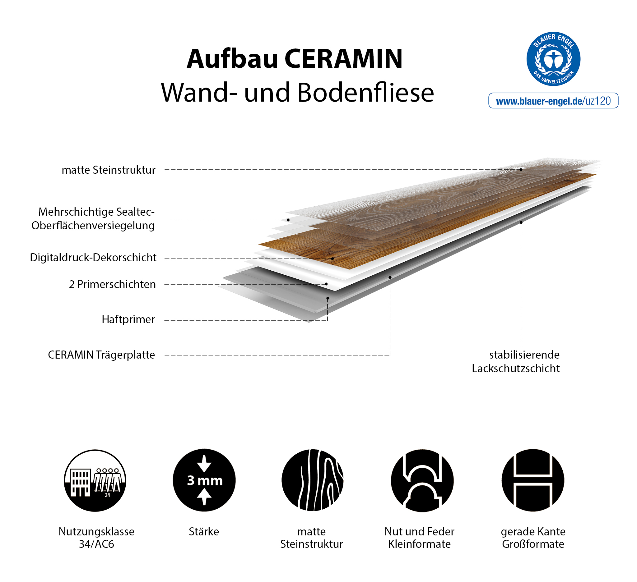 Wand- und Bodenbeläge von Parkett Hinterseer unterschieden sich deutlich von anderen Vinyl- und Designbelägen, da sie auf dem wohngesunden und nachhaltigen Werkstoff CERAMIN basieren. CERAMIN, ein keramikähnlicher Werkstoff auf mineralischer Basis, ist frei von schädlichen Inhaltsstoffen, extrem robust und hoch belastbar. Aufgrund seiner geringeren Materialdichte ist er wesentlich leichter als Keramik, extrem stabil und wasserfest. Er kann zu 100 % recycelt werden.