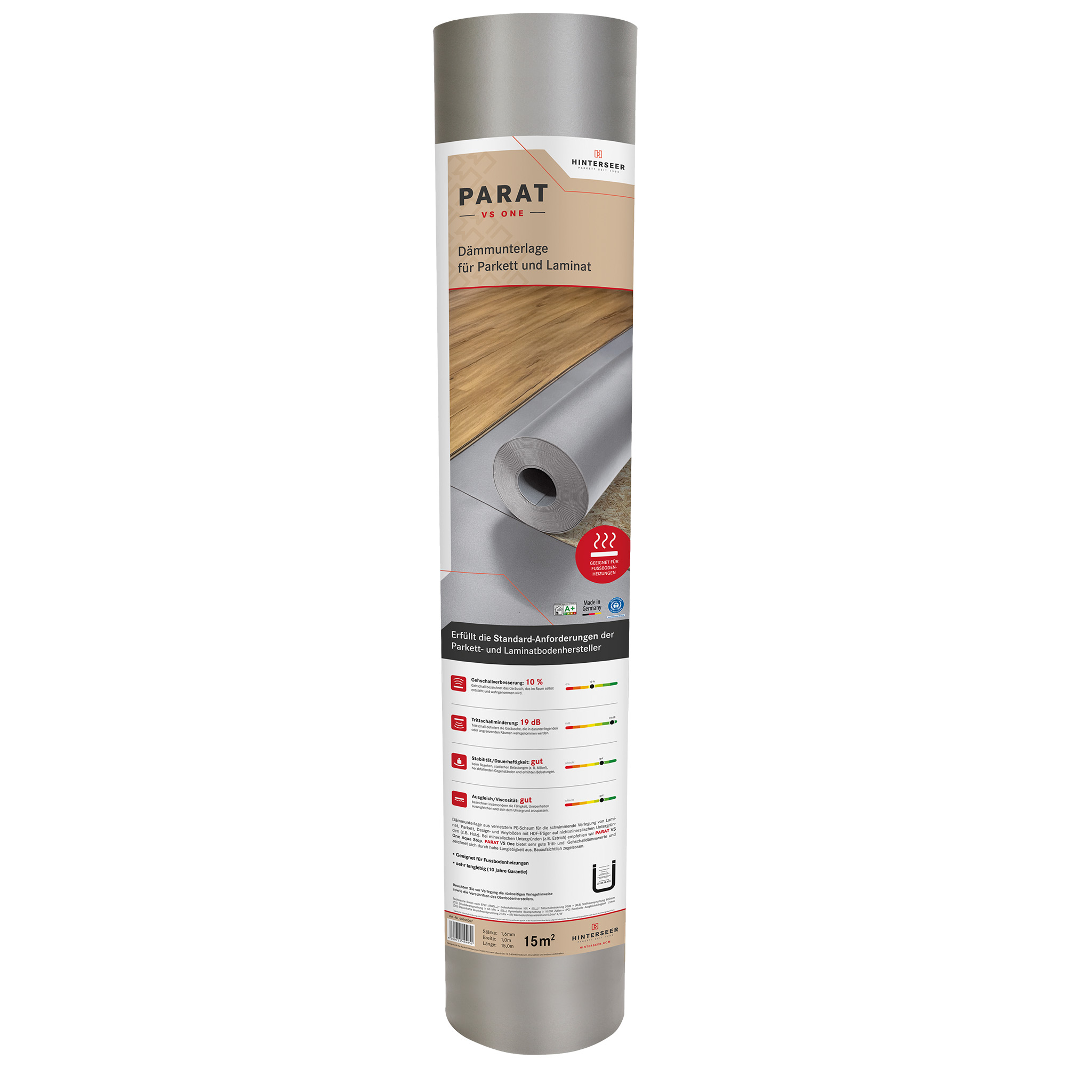Dämmunterlage aus vernetztem PE-Schaum für die schwimmende Verlegung von Laminat, Parkett, Design- und Vinylböden mit HDF-Träger. Sie bietet gute Tritt- und Gehschalldämmwerte und zeichnet sich durch hohe Langlebigkeit aus. Bauaufsichtlich zugelassen.