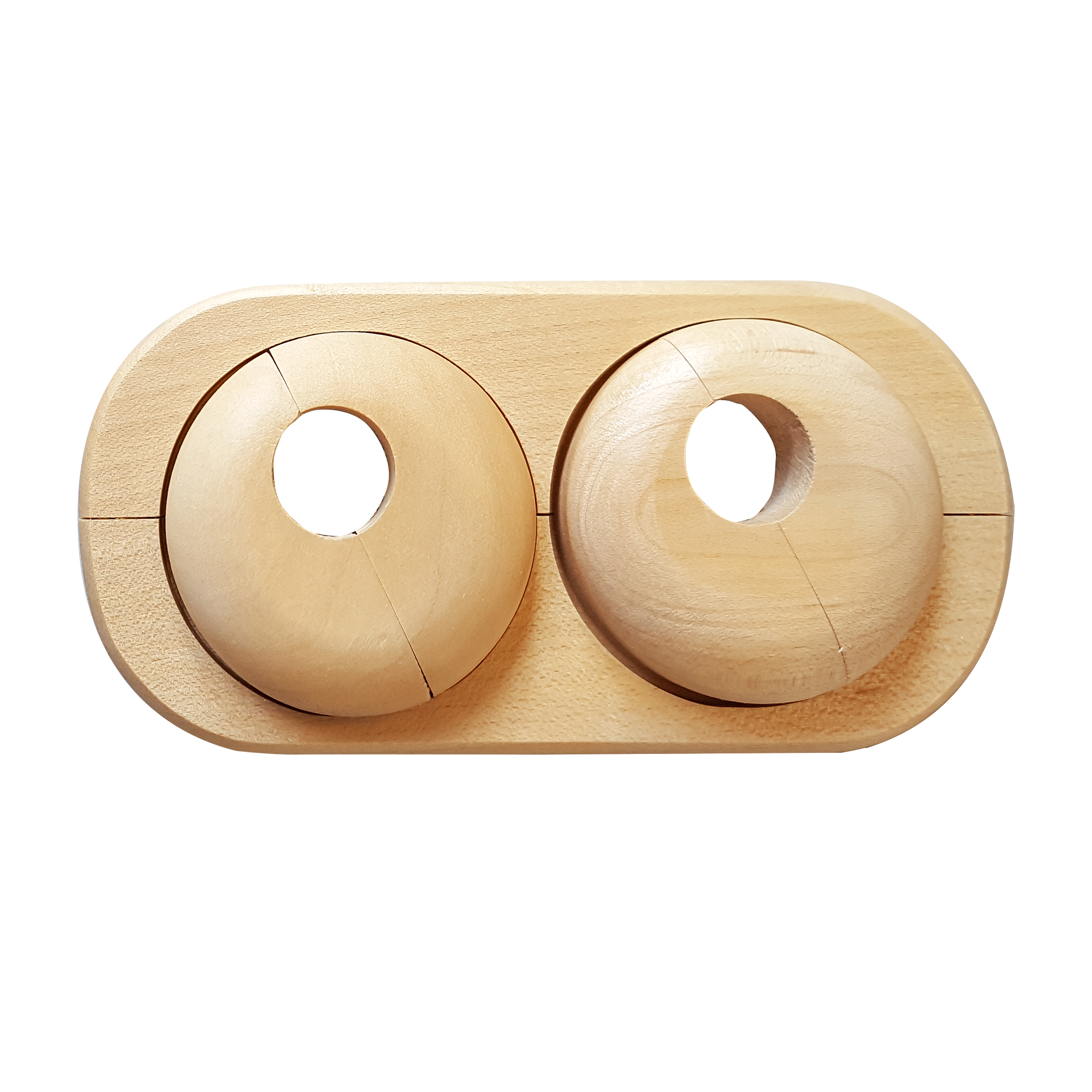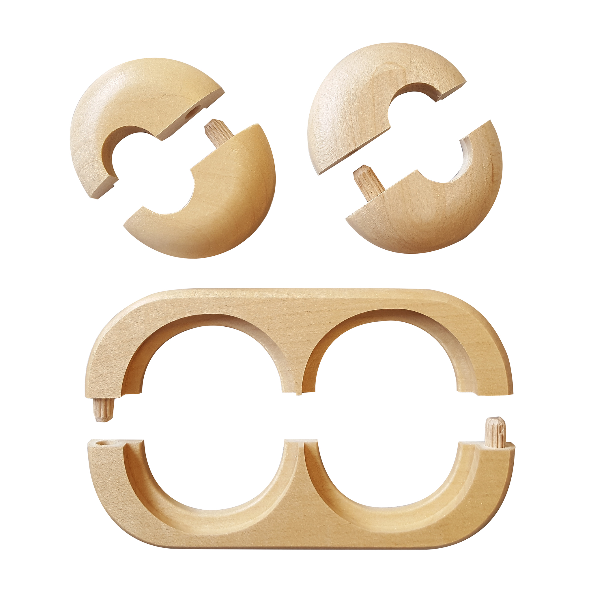 Die lackierte Heizkörperrosette aus Ahorn hat einen Innendurchmesser von 16 mm. Sie besteht aus sechs Teilen, passend für 2 Heizrohre und wird mittels Steckverbindung um das Rohr herum montiert.