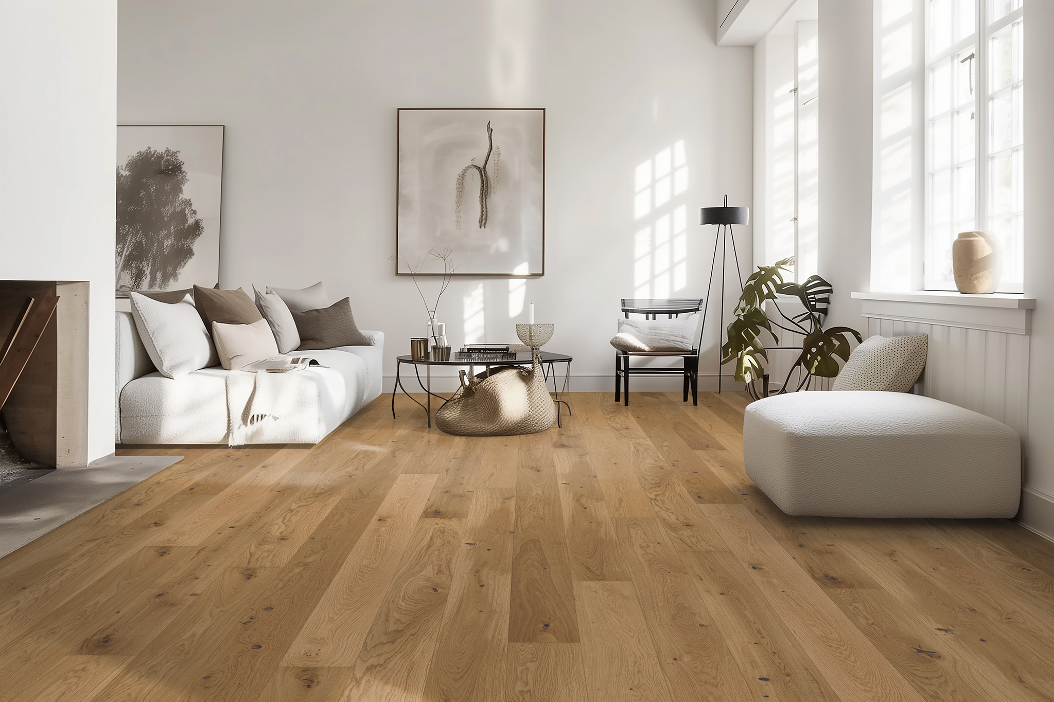 Die Landhausdiele Eiche Supercountry mit supermatter Lackierung passt ideal zu einem puristischen und klar strukturierten Wohnstil. Das Parkett ist perfekt, um ein Möbelstück oder Gemälde in Szene zu setzten, indem die Dielen auf diesen Hingucker zulaufen. So setzten Sie mit Ihrer Wohnung ein wahres Statement.
