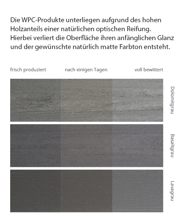 DIE EXKLUSIVE WPC-Terrassendiele vereint edle Grautöne mit purer Eleganz. Sie ist die Terrassendiele für puristisch cleane Architekturen. Genießen Sie Ihren Lieblingsplatz in einem von drei attraktiven Farben: Von hellem Dolomitgrau, über kühles Basaltgrau zu warmen Lavagrau überzeugt die massive Terrassendiele durch ihre lebendige Farbgebung. Die matte, geprägte Oberfläche, ähnlich dem Naturstein, zaubert ein besonders ebenmäßiges und modernes Gesamtbild.