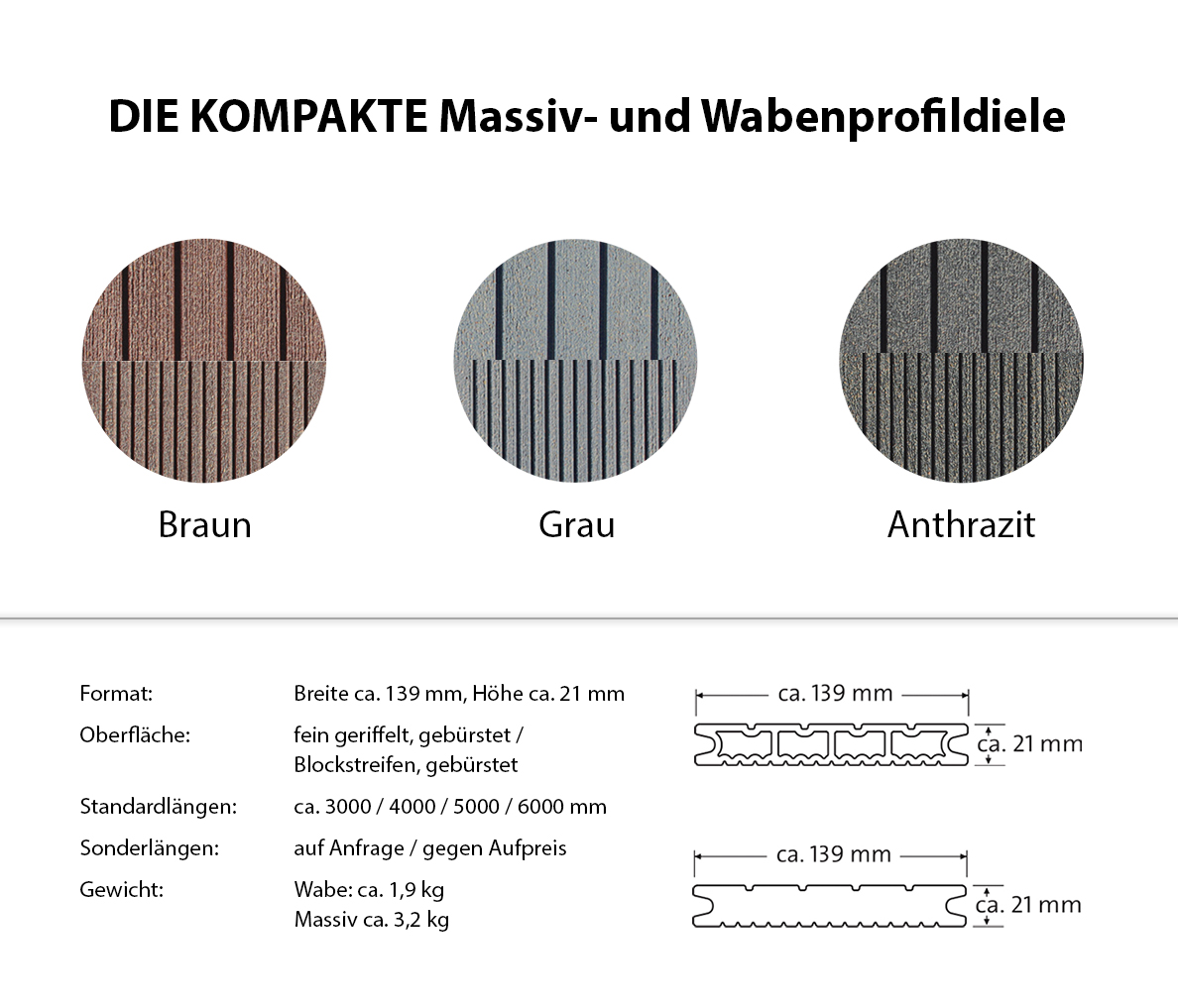 Genießen Sie die Sonnenstunden auf einer einladenden Terrasse mit stilvoller Holzdielenoptik. DIE KOMPAKTE als Massiv- oder Wabenprofildiele verbindet Funktionalität mit einer stilvollen Holzdielenoptik in einem guten Preis-Leistungs-Verhältnis. Fein geriffelt auf der einen Seite - grobe Blockstreifen auf der anderen. Um die natürliche Holzdielenoptik zu erreichen sind beide Seiten gebürstet. Mit ihrer Oberflächenstruktur und den drei ansprechenden Farben Braun, Grau und Anthrazit lädt DIE KOMPAKTE Terrassendiele zum Entspannen und Verweilen ein. Dank ihrer Ausführung als Massiv- und leichte Wabendiele in verschieden Farben bietet die Terrassendiele große Gestaltungsfreiheit.