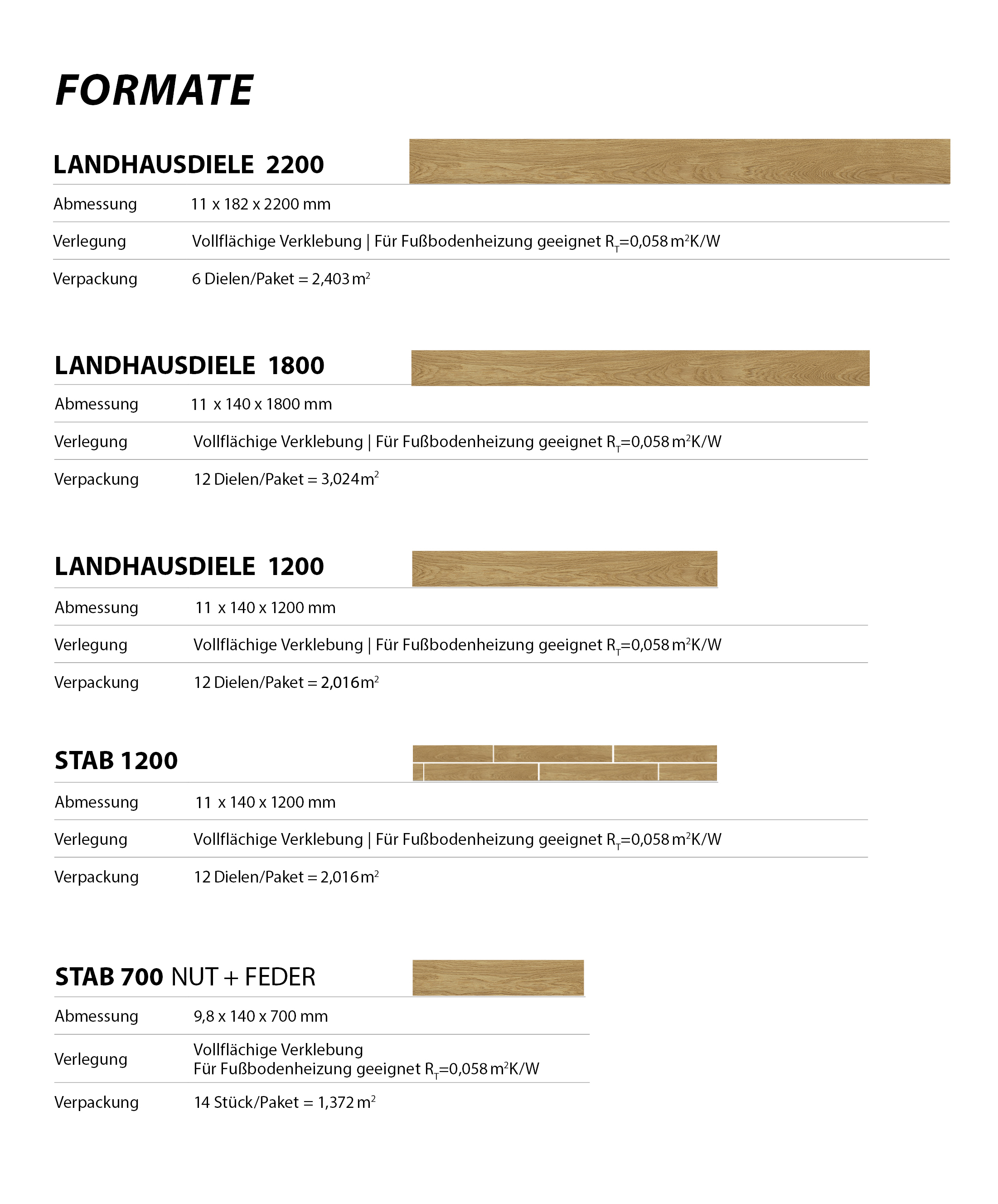 - Optik: Landhausdiele (1-Stab), Schiffsboden (2-Stab), 1-Stab mit Nut-Feder mit verschiedenen Verlegemustern (9,8 mm)