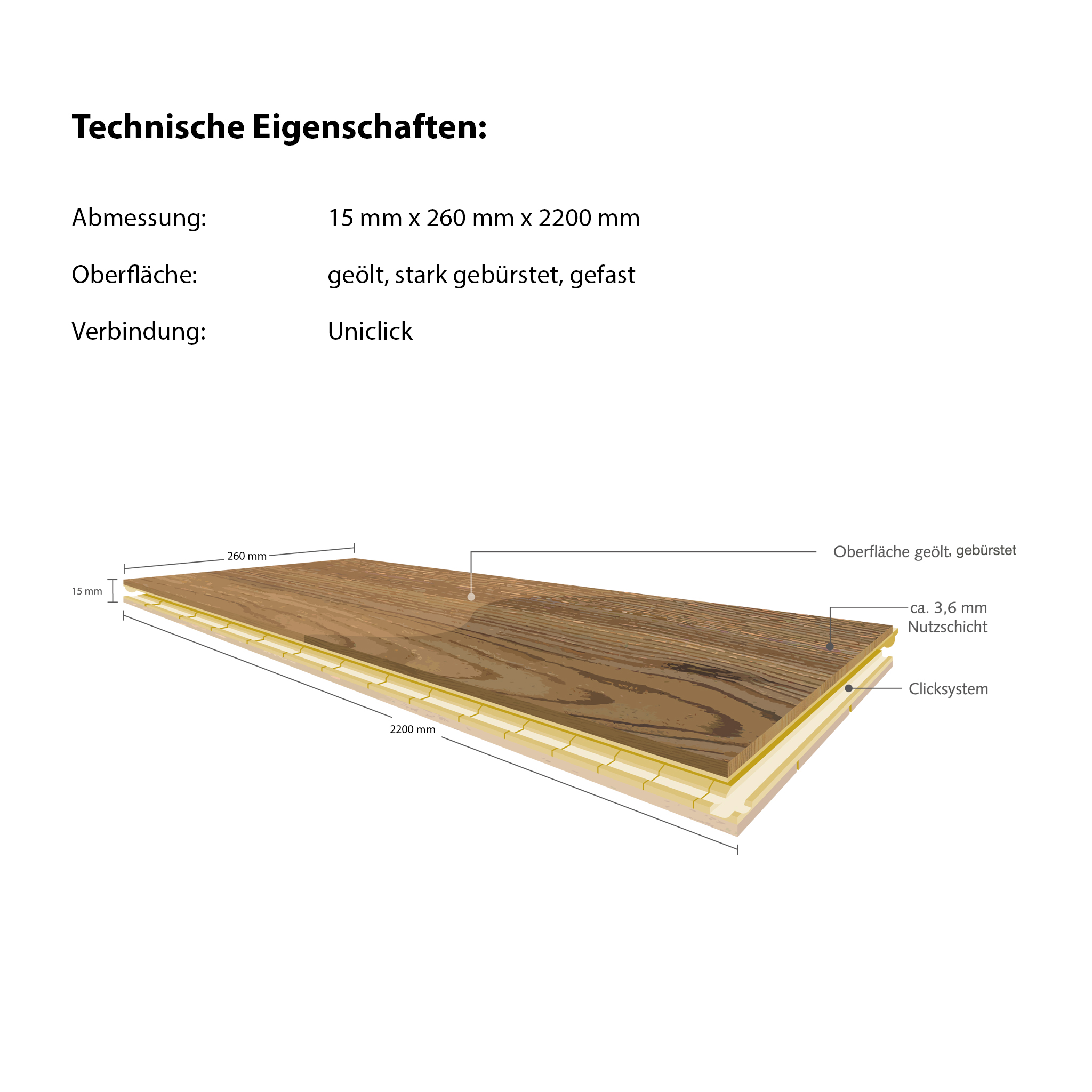 Alle Oberflächen sind gebürstet und mit oxidativ gehärteten Ölen vorbehandelt. Die Microfase unterstreicht optisch jede einzelne Diele. Darüber hinaus zeichnen sich die Holzdielen mit einer deutlich sichtbaren und spürbaren Oberflächenstruktur aus. Mit dem äußerst passgenauen Drop-Down Klicksystem kann die schwimmende Verlegung sowie die vollflächige Verklebung (generell auf Fußbodenheizung) einfach und sicher erfolgen.