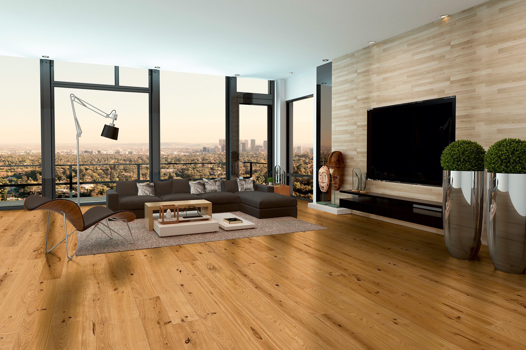 Landhausdiele 1800 und 2200 (3-Schicht-Parkett): Die großzügige Diele schafft eine weitläufige Optik und verleiht großen Räumlichkeiten mehr Ausdruck. Die Einzigartigkeit und Natürlichkeit des Werkstoffes Holz werden besonders gut zur Geltung gebracht.