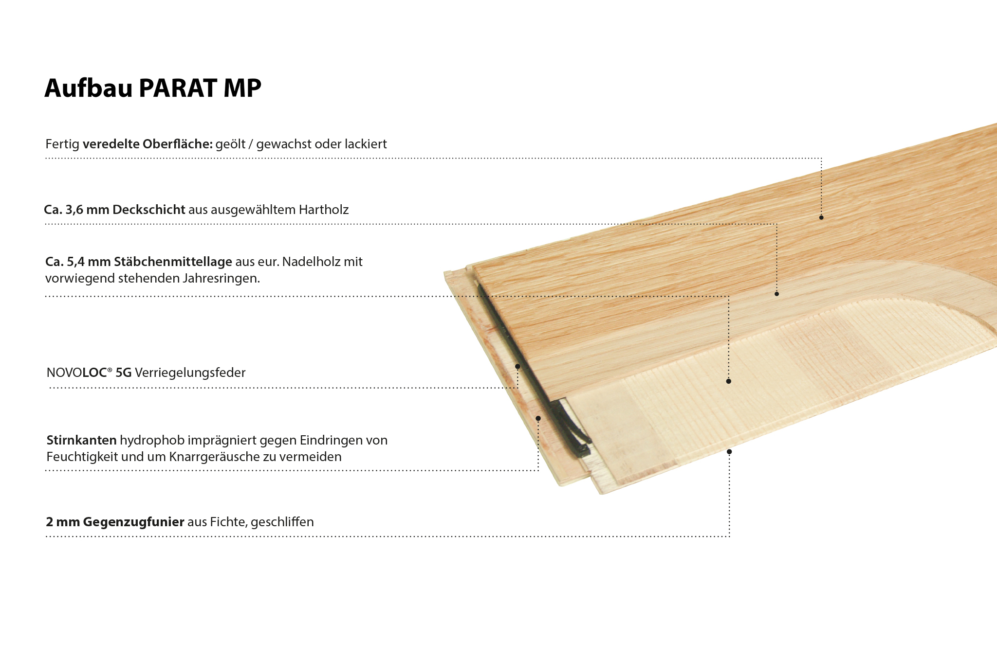 PARAT® MP ist die neue innovative Parkettlinie in vier verschiedenen Formaten mit fertig geölt/gewachster oder lackierter Oberfläche. Das Eiche-Fertigparkett bildet eine Symbiose aus modernster Verbindungstechnologie und einem attraktiven Sortiment für ein völlig neues Wohnerlebnis.