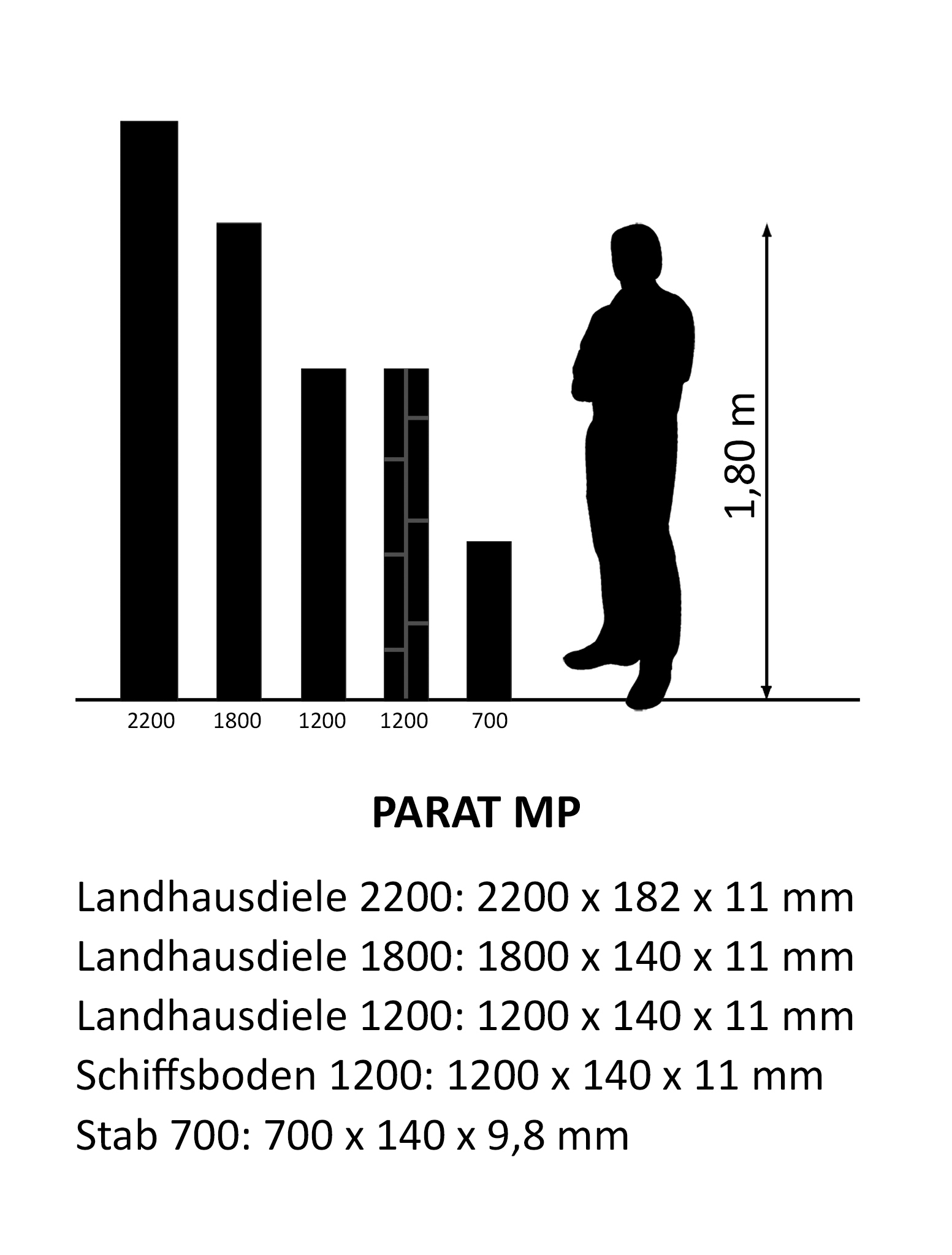 - Verfügbar als Zweischichtparkett (2-Stab Schiffsbodenoptik und Stab 700) und Dreischichtparkett (Landhausdiele 1200, 1800, 2200)