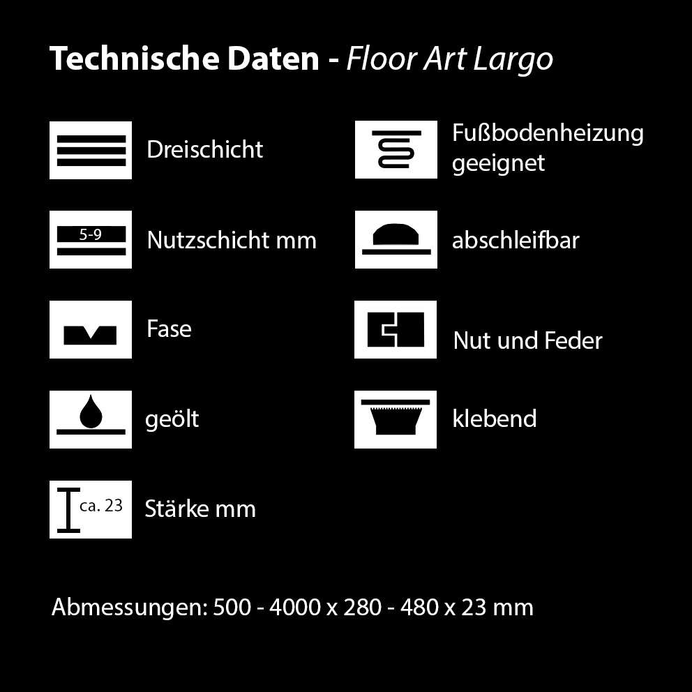 Erleben Sie Parkett in seiner reinsten und ursprünglichsten Form. Die von Hand gefertigten Langdielen aus der Serie Floor-Art® Largo stehen für Qualität, Exklusivität, Natur und Nachhaltigkeit, was sich in ihrem außergewöhnlichen Erscheinungsbild wiederspiegelt: Höhendifferenzen bis zu 6 mm, verschiedene Längen und Breiten sowie eine einzigartige Oberfläche prägen den Charakter dieser rustikalen Langdielen. Somit erhält jede Diele ihre eigene einzigartige und exklusive Ausstrahlung.