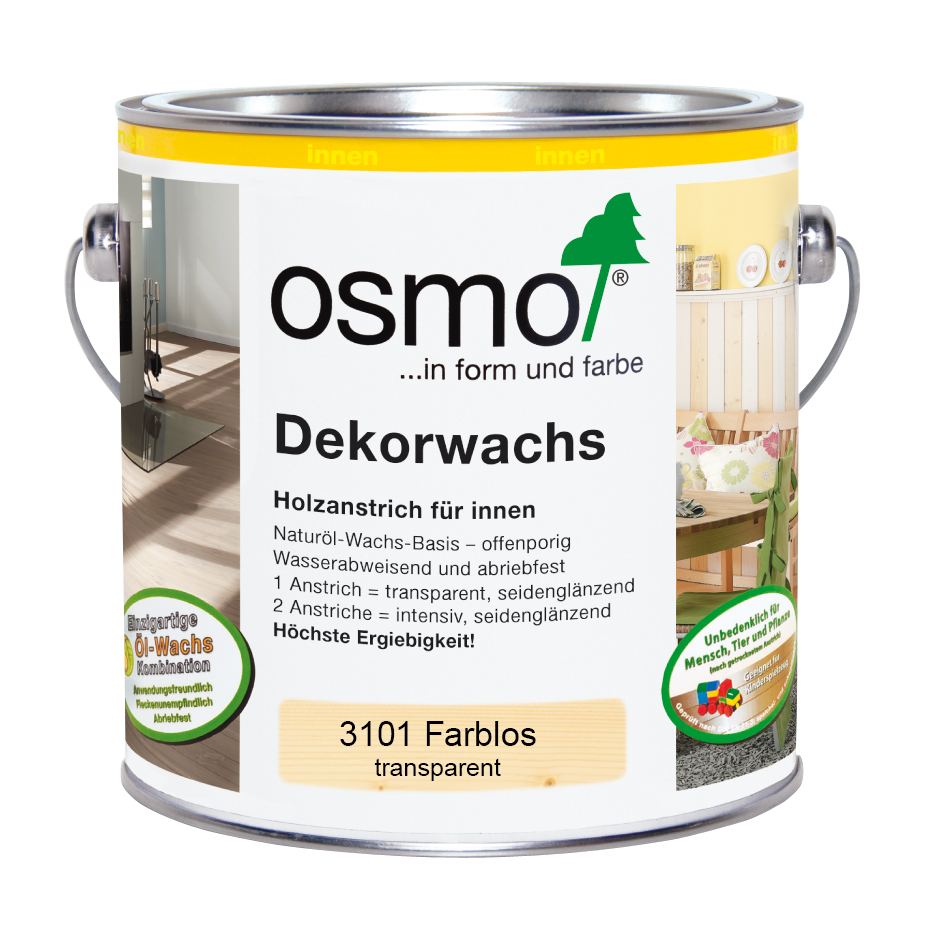 Osmo Dekorwachs eignet sich für den Schutz und die dekorative Veredelung von Holz im Innenbereich: Wandverkleidungen, Leisten und Balken sowie Türen. Es ist ebenfalls geeignet für Leimholz, Spanplatten und MDF. Ideal als farbige Grundierung für Holzfußböden und zum Überstreichen nachgedunkelter Holzflächen. Für Möbel und Kinderspielzeug besonders empfohlen.