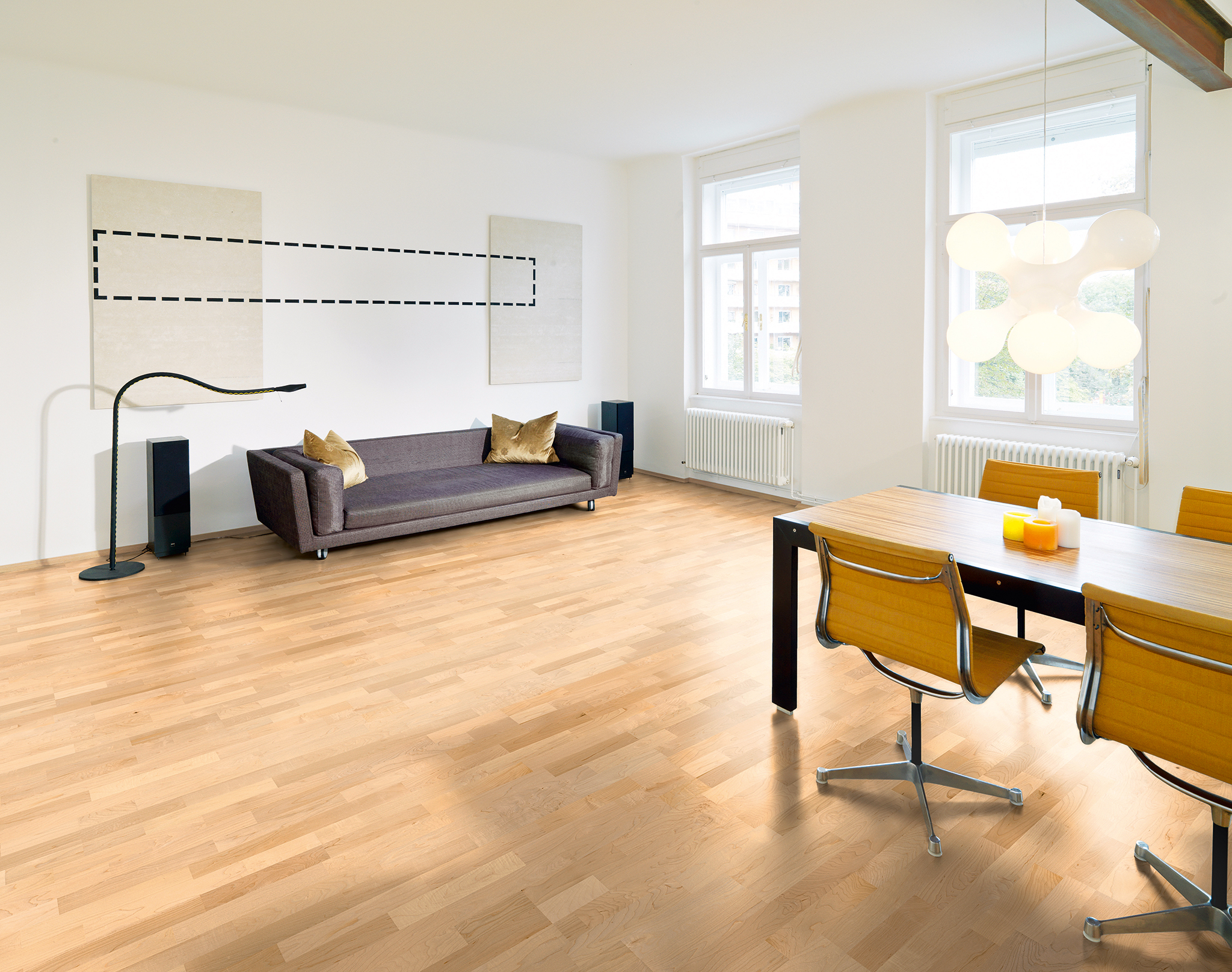 Die einfache und sinnfähige Verlegetechnik der PARAT® 190 Schiffsböden schafft klare, schöne geschlossene homogene Flächen, die in sich selbst aber reich strukturiert sind. Es entsteht ein unaufdringlich leises Gemälde aus natürlichen Wuchsformen: Maserungen stoßen neu und vertraut aneinander und rhythmisieren die Fläche. Die Schiffsböden sind wahrhaft luxuriös und immer individuell. Die Wahl der Holzart bestimmt die "Temperatur" dieser Harmonie.