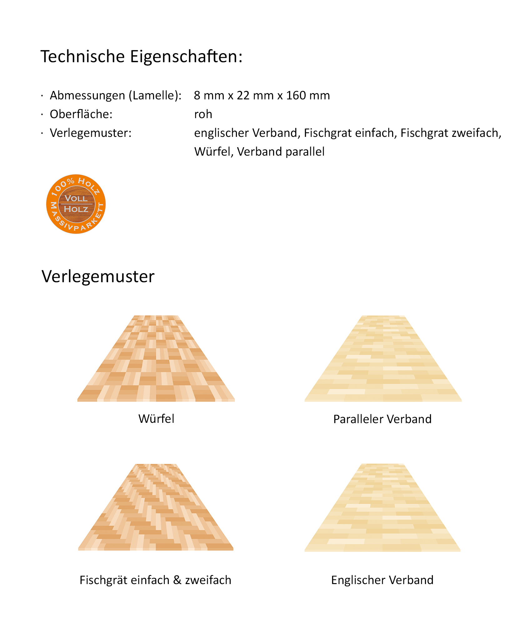 PARAT® 8 Mosaikparkett wird aus 22 mm schmalen und 160 mm langen Vollholzlamellen mit einer Stärke von 8 mm geschnitten. Die einzelnen Stäbe werden zu verschiedenen Musterplatten zusammengefügt. Beliebte Muster sind: Paralleler Verband, Englischer Verband, Fischgrat und Würfelmuster. Die PARAT® 8 Musterplatten werden vollflächig auf den