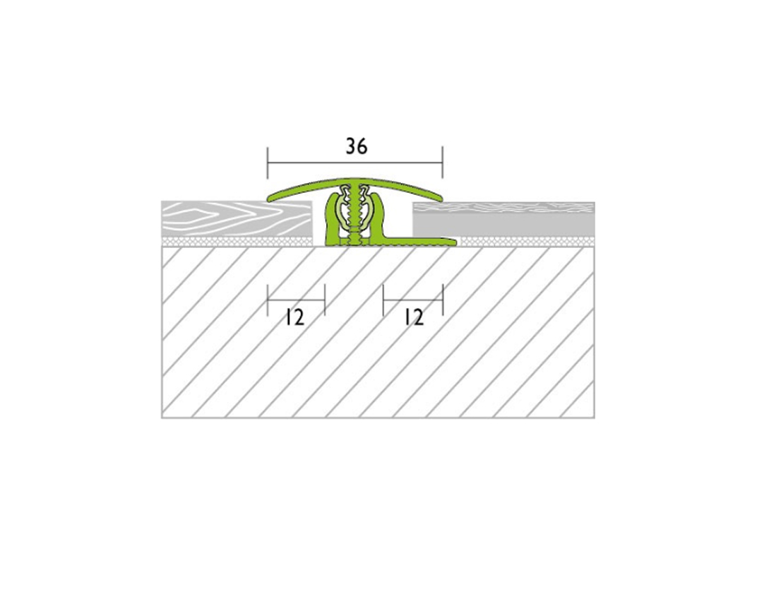Dank der patentierten Drehgelenktechnik kann das Deckprofil stufenlos in Höhe und Neigung den angrenzenden Bodenbelägen angepasst werden. Unterschiedliche Niveaus können somit durch das Übergangsprofil millimetergenau angepasst werden.