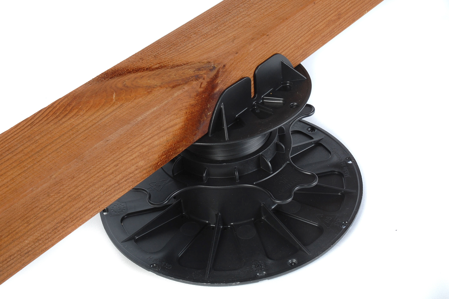 Differences in height and slope can be easily compensated with the terrace bases. The adjustable foot impresses with its low weight and very good ventilation. Due to the air circulation, the substructure is reliably protected against waterlogging and ground frost. In addition, the swelling and shrinking behavior is greatly reduced.