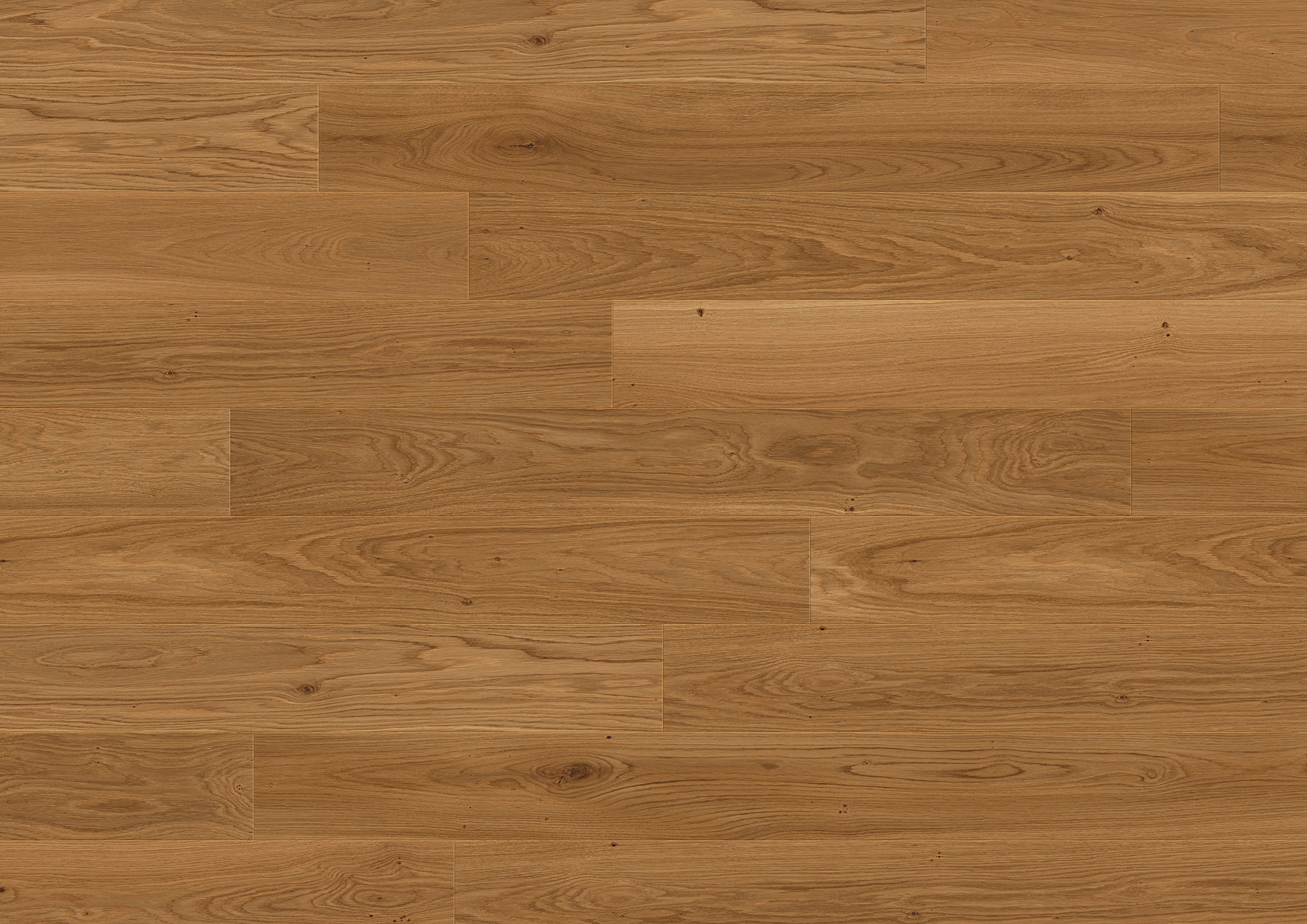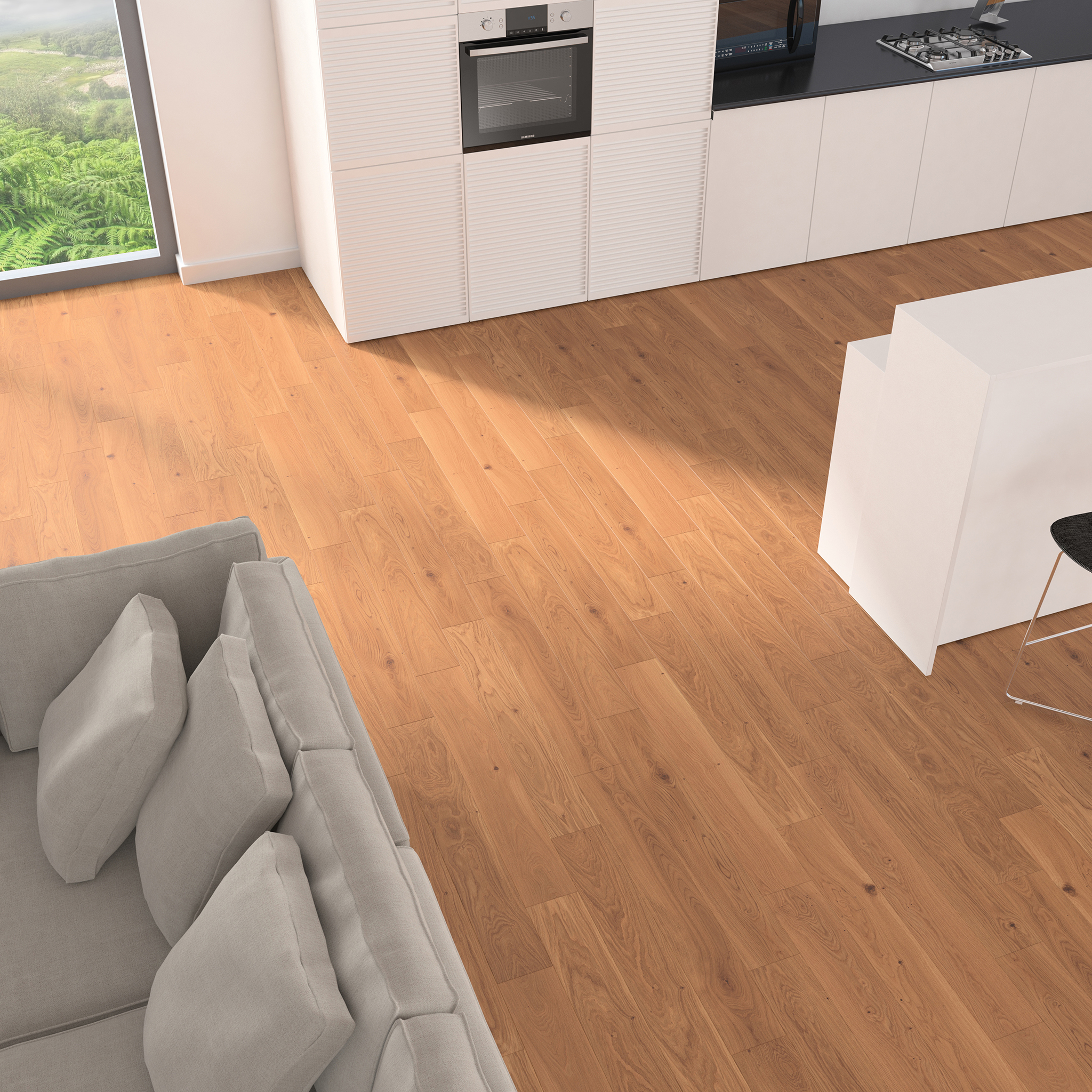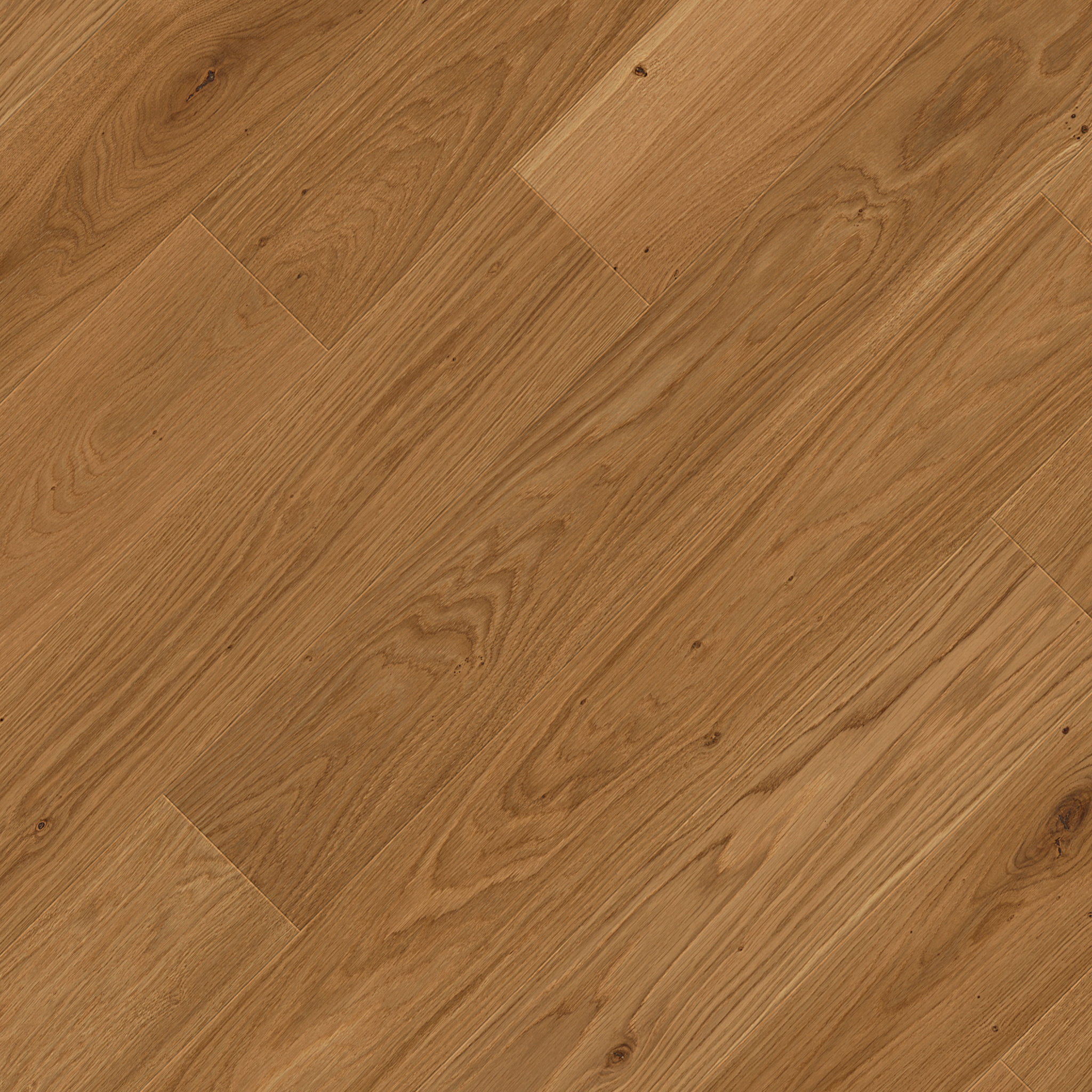 The two-layer pre-finished parquet is glued with a 3.6 mm top layer with multiplex counter pull. It is provided with a tongue-and-groove connection and is available in the Prime, Nature, Markant or Rustic grades. The surface of the planks is ready lacquered or oiled and therefore immediately habitable.