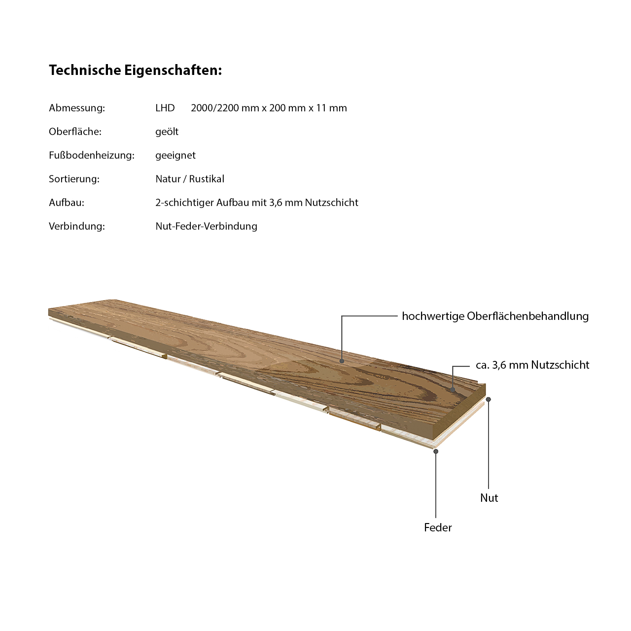 2000x200x11mm, 2-layer parquet, oiled, with bevel, structured, T/G (2,400m²)