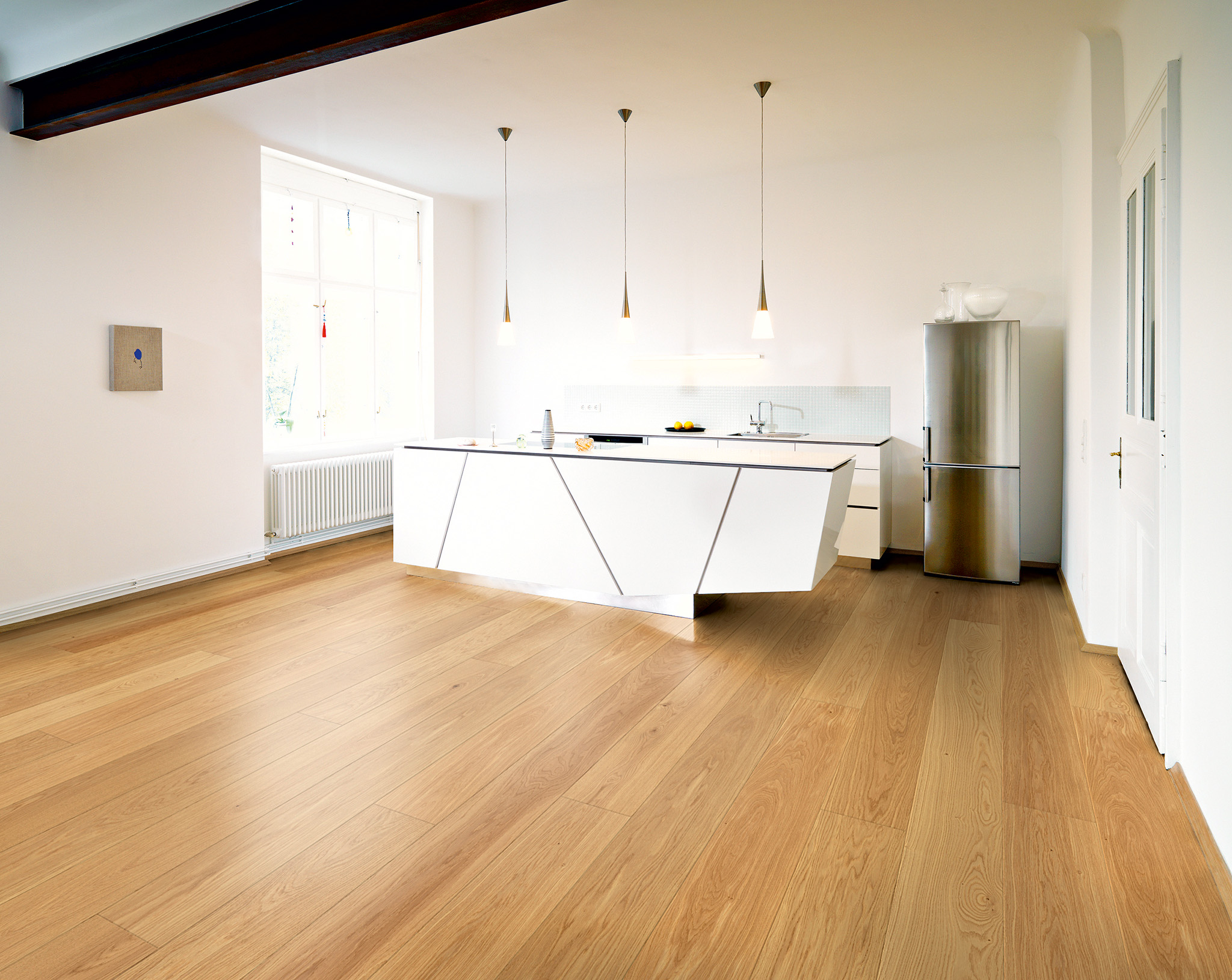 In addition to the high-quality and clean UV-seal, you can choose oiled / waxed as well as brushed, chamfered and colored surfaces. The use of a precious wood layer conserves resources and the three-layer gluing creates stability and predestines the product for laying on modern floor heating systems.