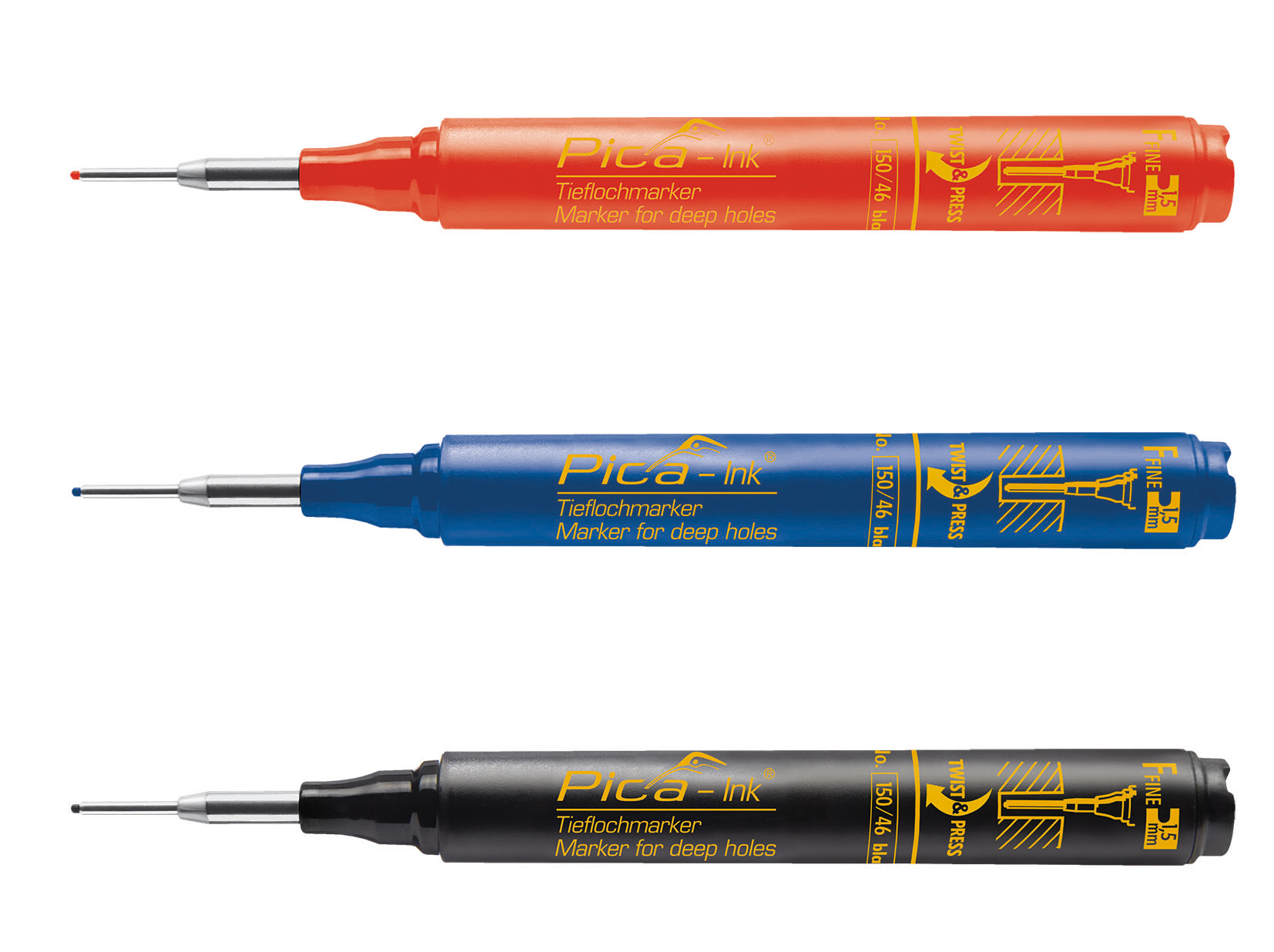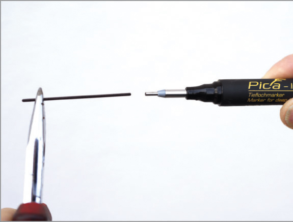 The deep hole marker is ideal for all hard-to-reach places thanks to the patented telescopic tip. It marks on almost all dry material surfaces with a line width of 1.5 mm. The self-adjusting telescopic tip made of stainless steel enables up to 3 times higher writing performance. In addition, the tip of the deep hole marker can be rotated 180°. The round quiver saver allows for easy one-handed operation.