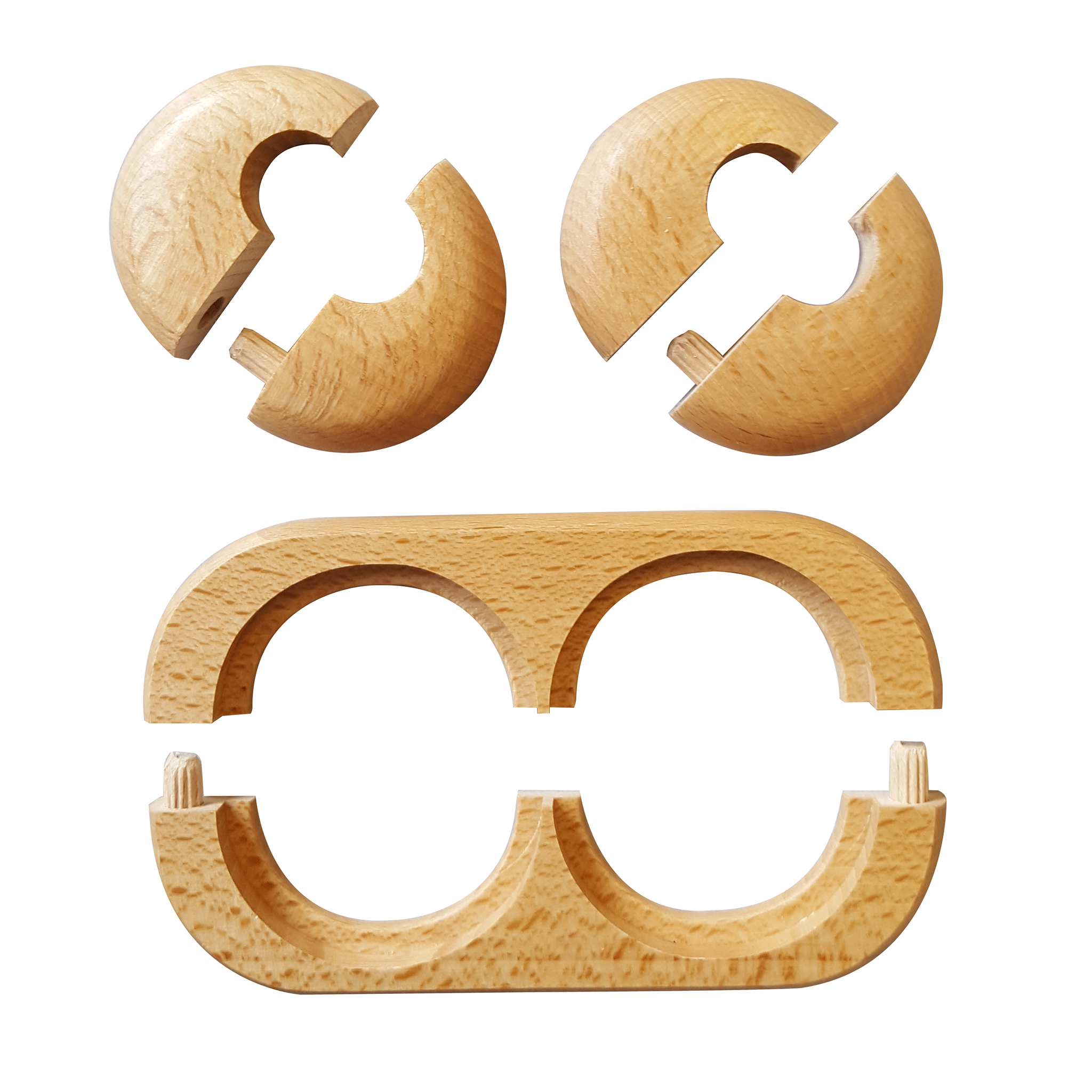 The painted radiator rosette made of beech has an inner diameter of 16 mm. It consists of six parts, suitable for 2 heating pipes and is mounted by means of plug-in connection around the pipe.