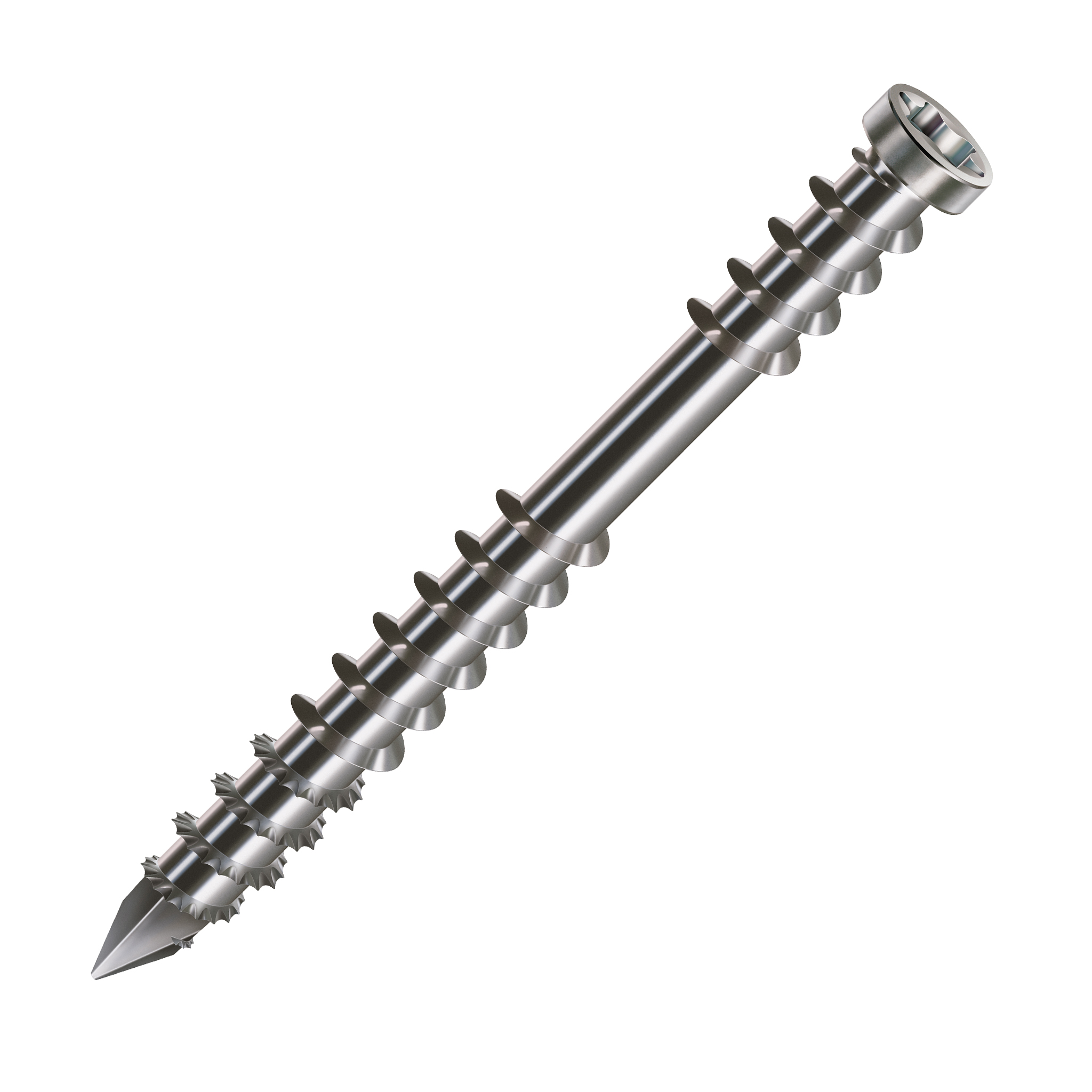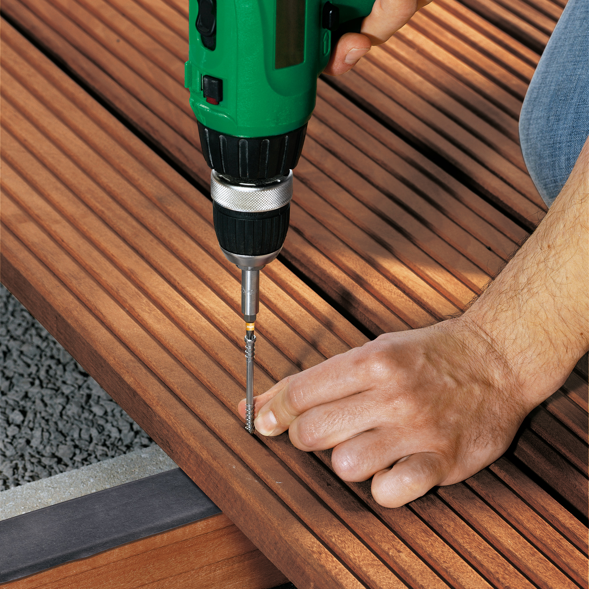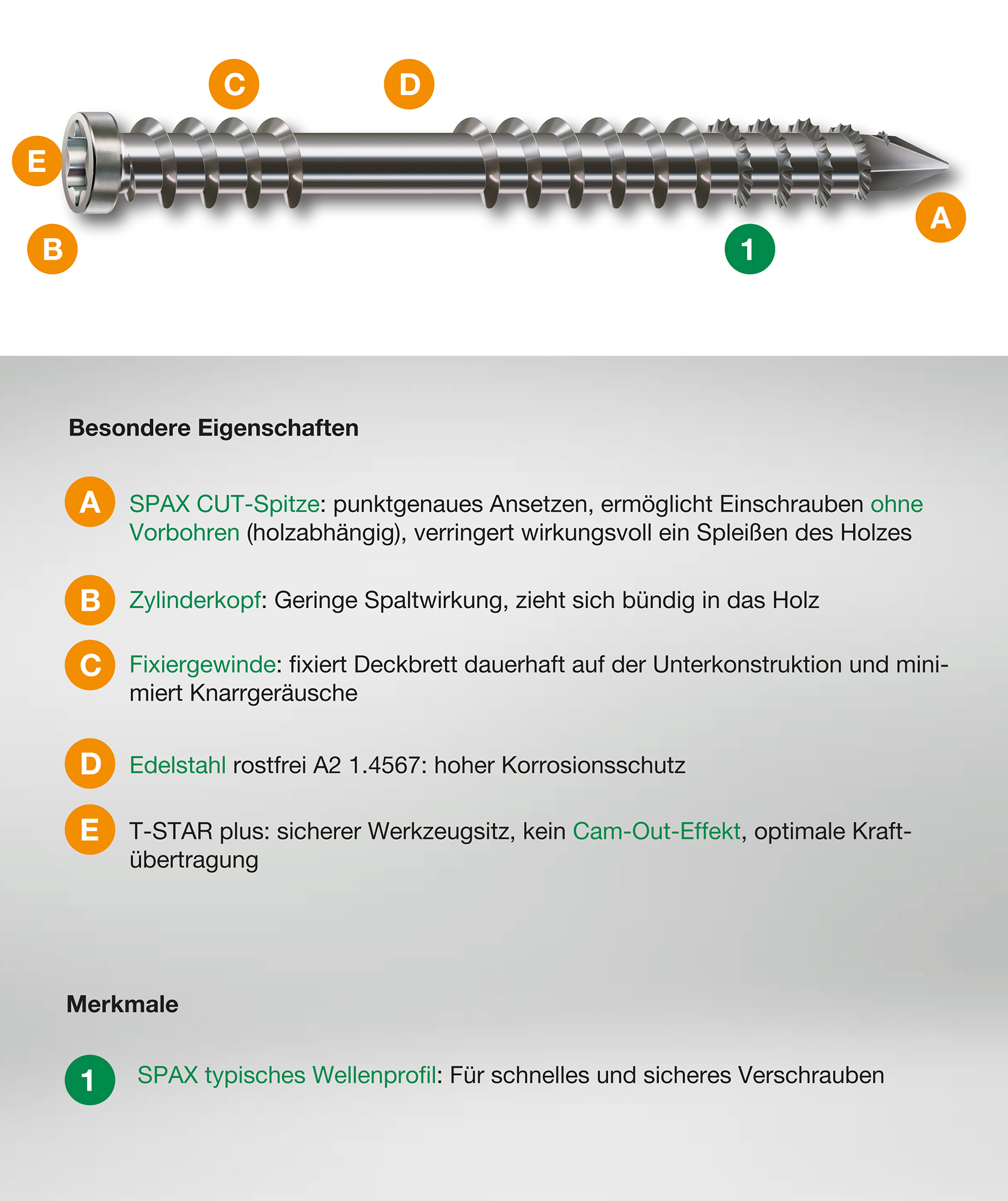 The cylinder head of the SPAX screws can be easily countersunk into the wood and, due to the small head diameter, allows for an almost invisible screw connection. In addition, the terrace screws are rust-free and have a high corrosion protection.